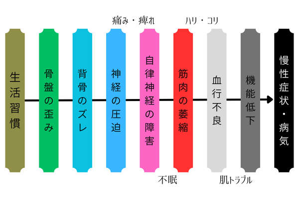 生活習慣が悪化すると、骨盤・背骨の歪みやズレが起こり、そのことにより神経圧迫・筋肉の萎縮・